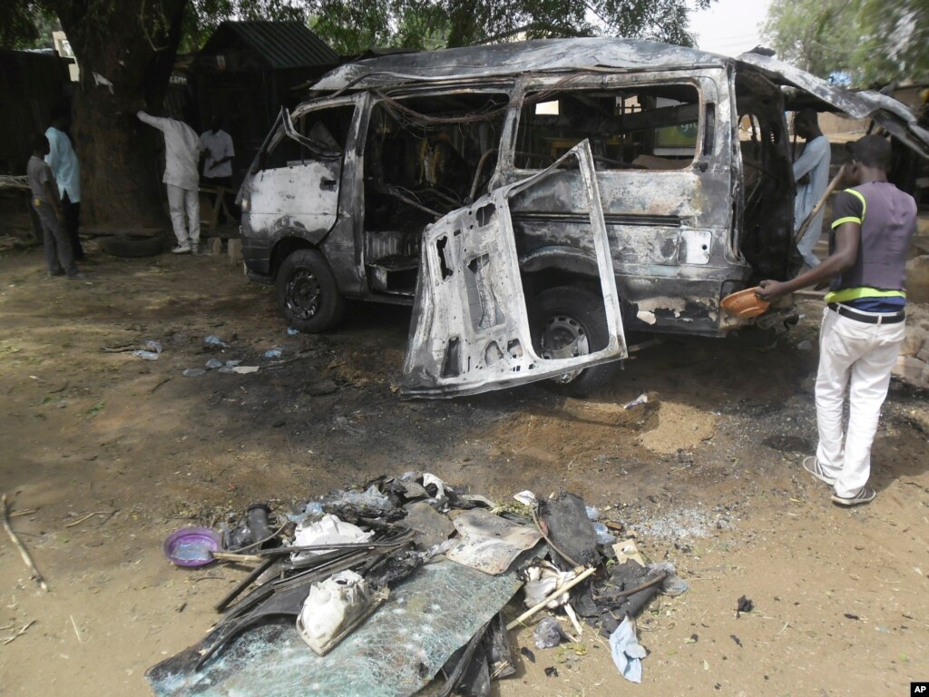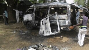 Men inspect a bus following an explosion on the street in Potiskum, Nigeria, Feb. 24, 2015.