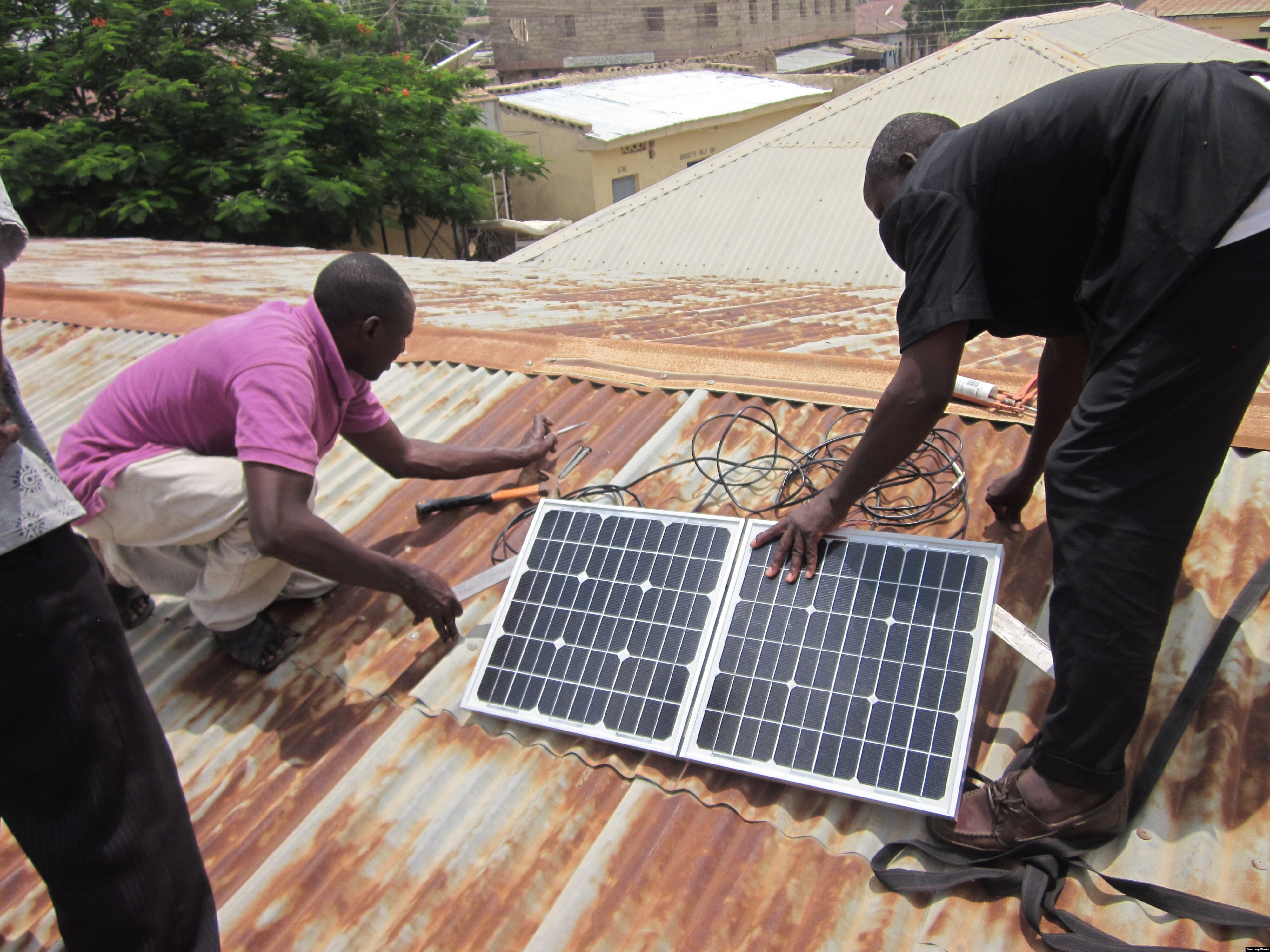 A solar panel is installed on the roof of a clinic in Kano, Nigeria. (Photograph courtesy of We Care Solar)