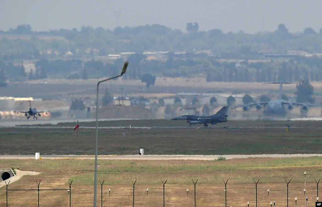 FILE - Turkish Air Force fighter planes maneuver on the runway at the Incirlik Air Base, in Adana, southern Turkey, Aug. 13, 2015.