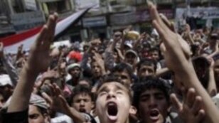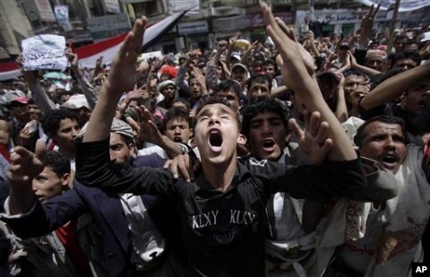 An anti-government protestor, center, reacts during a demonstration demanding the resignation of Yemeni President Ali Abdullah Saleh, in Sanaa, Yemen, March 6, 2011