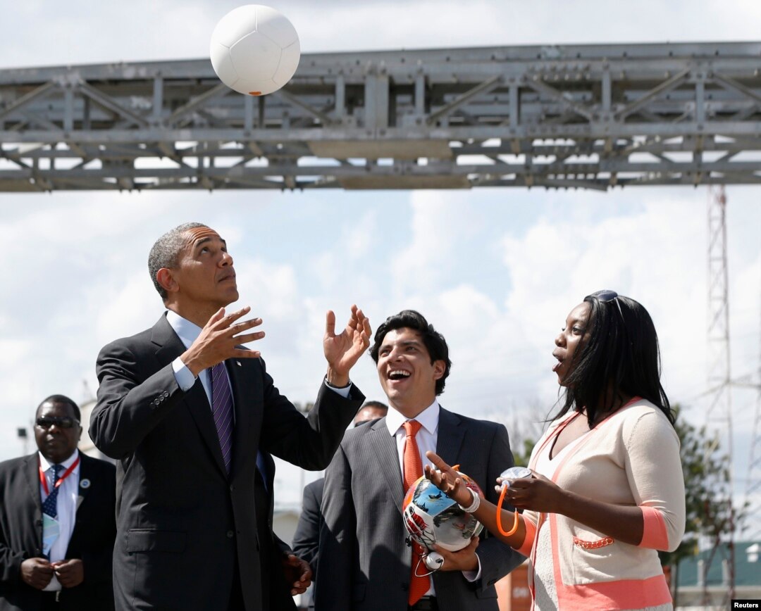 U.S. President Barack Obama heads a soccer ball at Ubungo Power Plant in Dar es Salaam, July 2, 2013. The ball called a "soccket ball" has internal electronics that allows it to generate and store electricity that can power small devices.