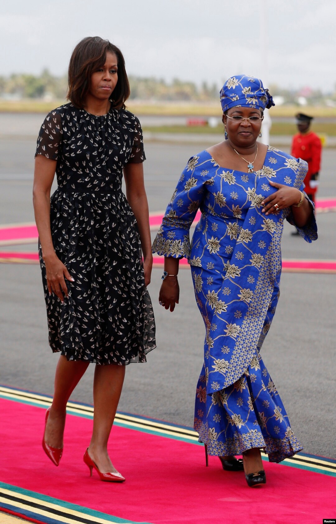 U.S. First lady Michelle Obama walks with Salma Kikwete, wife of Tanzania's president, during a departure ceremony in Dar es Salaam, July 2, 2013.