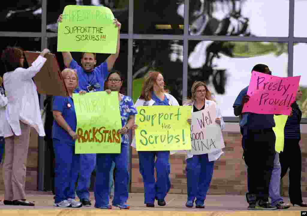 Texas Health Presbyterian Hospital Dallas staff line the drive that exits the emergency room as they wait for an ambulance carrying Nina Pham to depart, Oct. 16, 2014, in Dallas.