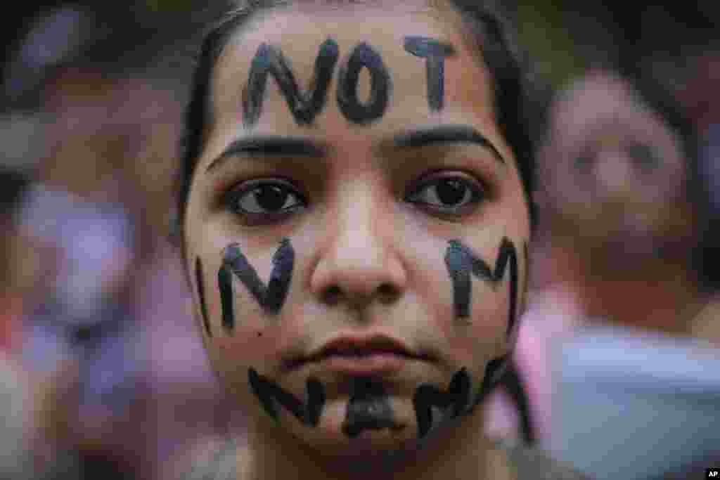 A participant is seen during a protest against two recently reported rape cases near the Parliament in New Delhi, India.