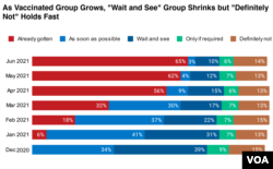 While the "definitely not" group is basically unchanged, the "wait and see" group has shrunk to a quarter of the size it was when vaccines began rolling out in December, as more and more people have gotten their shots.