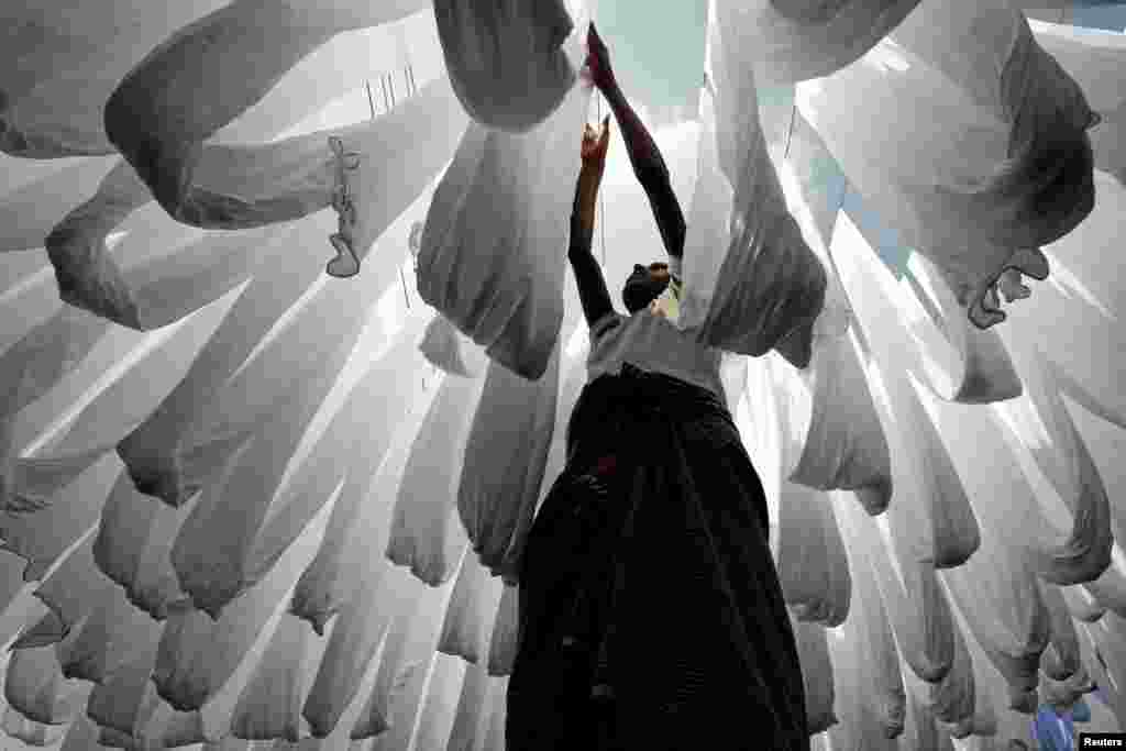 A dye factory worker dries fabric in Narayanganj near Dhaka, Bangladesh.