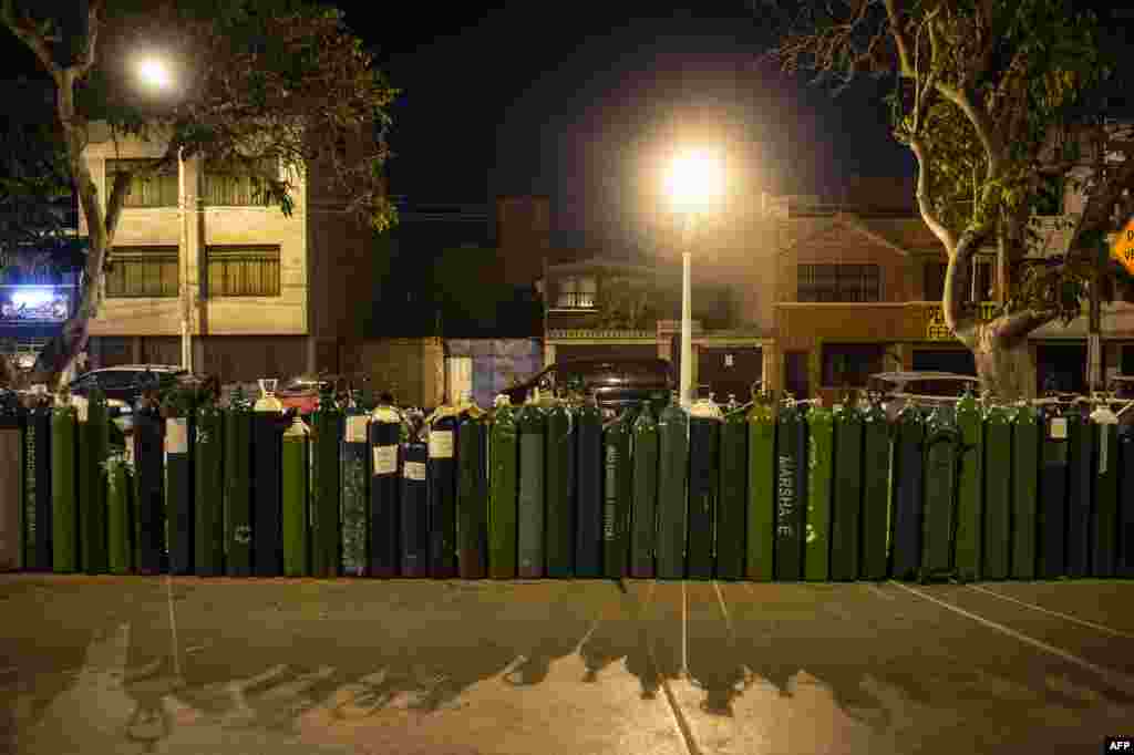 People queue to refill their empty oxygen cylinders in Callao, Peru, amid the COVID-19 pandemic. Relatives of people with COVID-19 are desperate for oxygen to keep their loves ones alive in Peru, where patients have been dying for lack of oxygen.