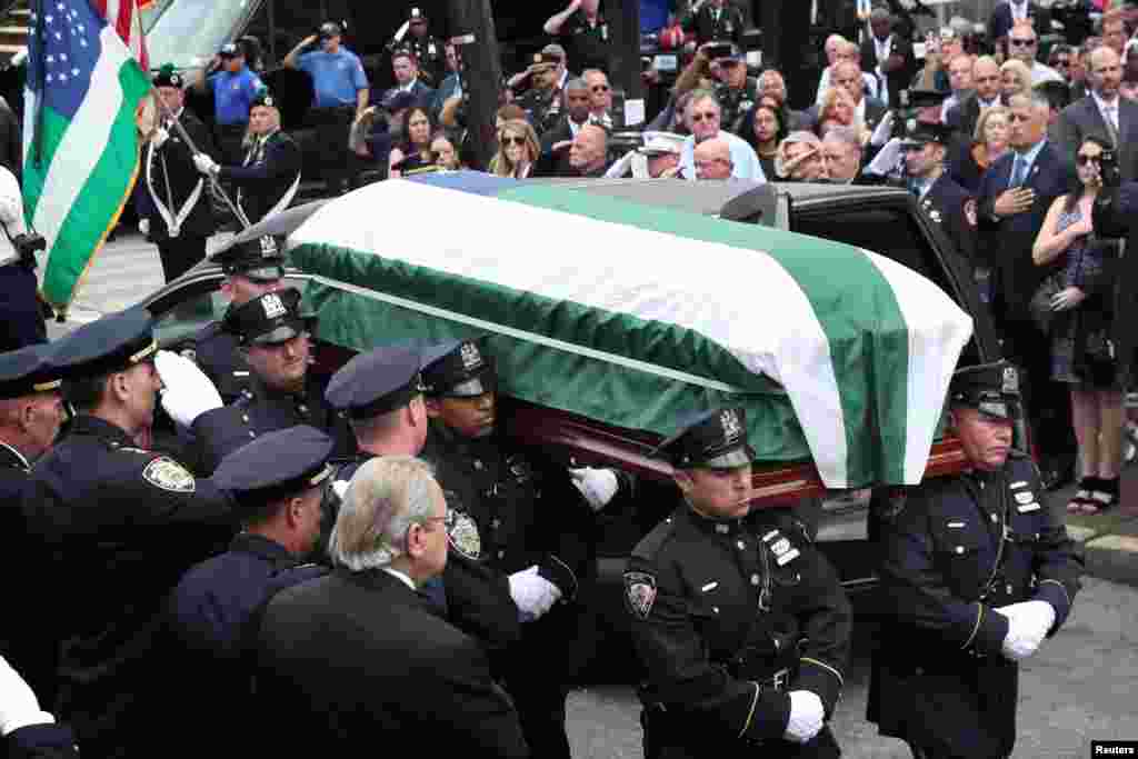 The casket of Luis Alvarez, a former New York City police detective who was diagnosed with cancer after working at Ground Zero, is carried into a church for his funeral in New York.