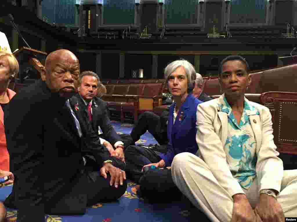 A photo tweeted from the floor of the U.S. House by Rep. Donna Edwards (R) shows Democratic members of the U.S. House of Representatives, including herself and Rep. John Lewis (L) staging a sit-in on the House floor to demand action on common sense gun legislation on Capitol Hill in Washington, D.C.