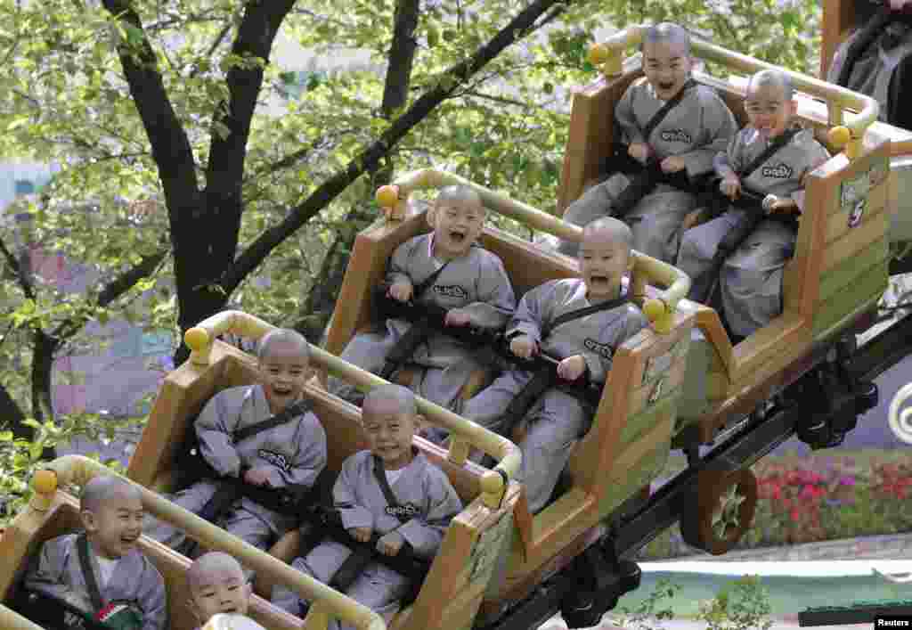 Child monks ride in a roller coaster during their visit to the Everland amusement park in Yongin, South Korea.