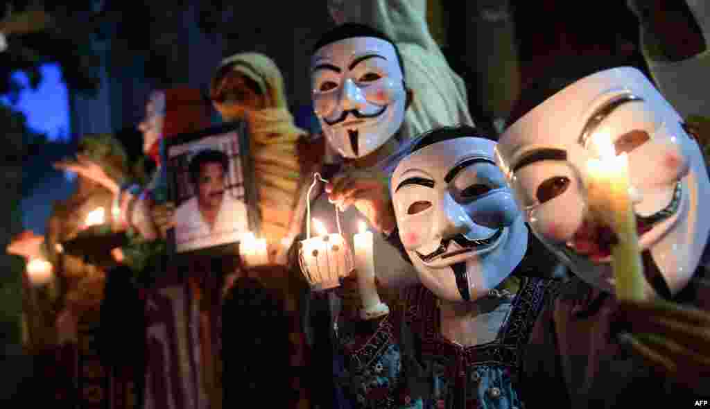 Relatives of missing Pakistanis wear Guy Fawkes masks as they observe Baloch Martyrs Day in Quetta.