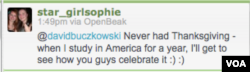 "I don't know much about the holiday, but I've seen the traditional turkey dinner in movies, and I'm really looking forward to that. We don't really eat turkey in China, mainly just chicken, beef and pork." – Chinese Michigan State University student Baiyu Peng in The Standard