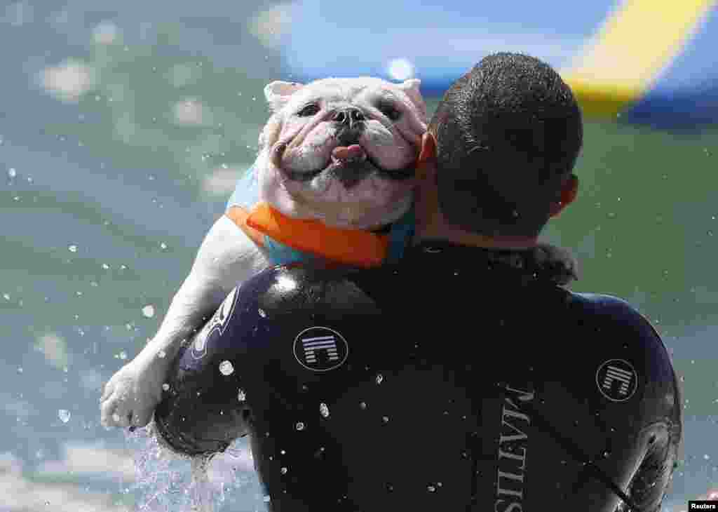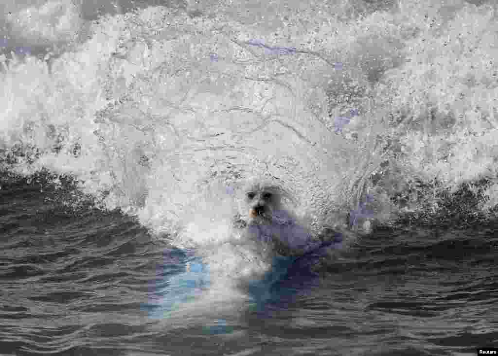 A dog is carried back into the water after riding a wave at the 6th Annual Surf City surf dog contest in Huntington Beach, California, Sept. 28, 2014.