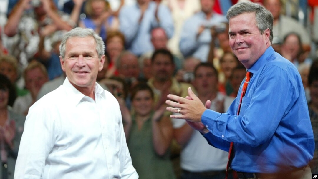 FILE - President George W. Bush, left, is introduced by his brother Florida Governor Jeb Bush (R) at a campaign rally, in Niceville, Florida, August 2004.